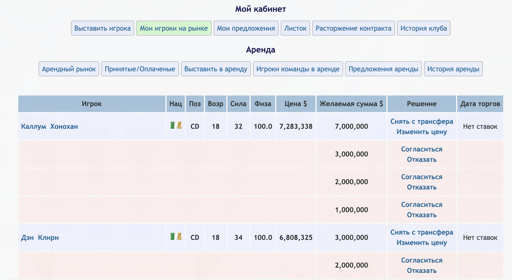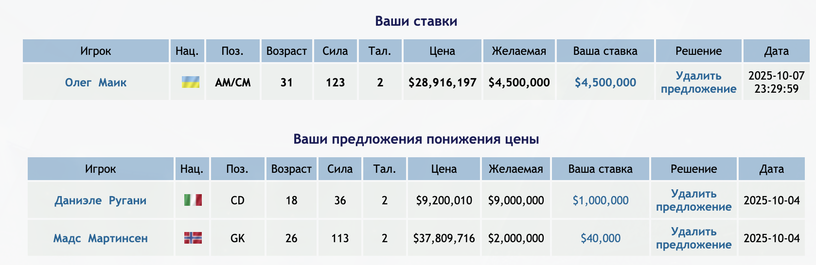- При снятии игрока с трансфера - все заяки удаляются. Всем прийдет сообщение.