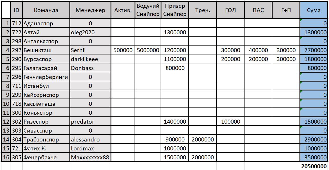 290 - Бурсаспор (Бурса, Турция) - Horrible - (активность, ведущий конкурса Страж ворот, ведущий конкурса Заправский форвард, 1 место в статистике ГОЛ, 1 место в статистике ПАС, 2 место в статистике ГОЛ+ПАС, 3 место в конкурсе КП31, 1 место в конкурсе Снайпер, 4 место в конкурсе Заправский форвард, 6 место в конкурсе Страж ворот) - 500000+4000000+4000000+300000+300000+200000+1300000+1500000+1200000+1000000=14300000